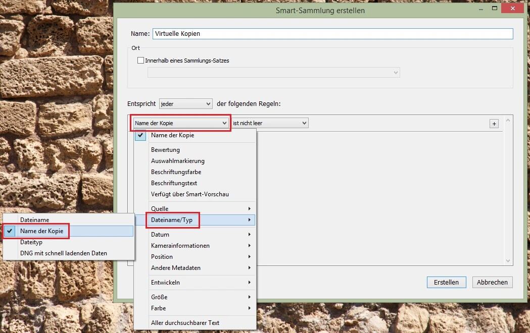 Ob man die Sammlung innerhalb eines Sammlungs-Satzes platziert, ist natürlich jedem freigestellt. Wichtig sind die Einstellungen bei den Regeln. Im Dropdown-Menü des ersten Feldes geht man unter „Dateiname/Typ“ auf „Name der Kopie“.