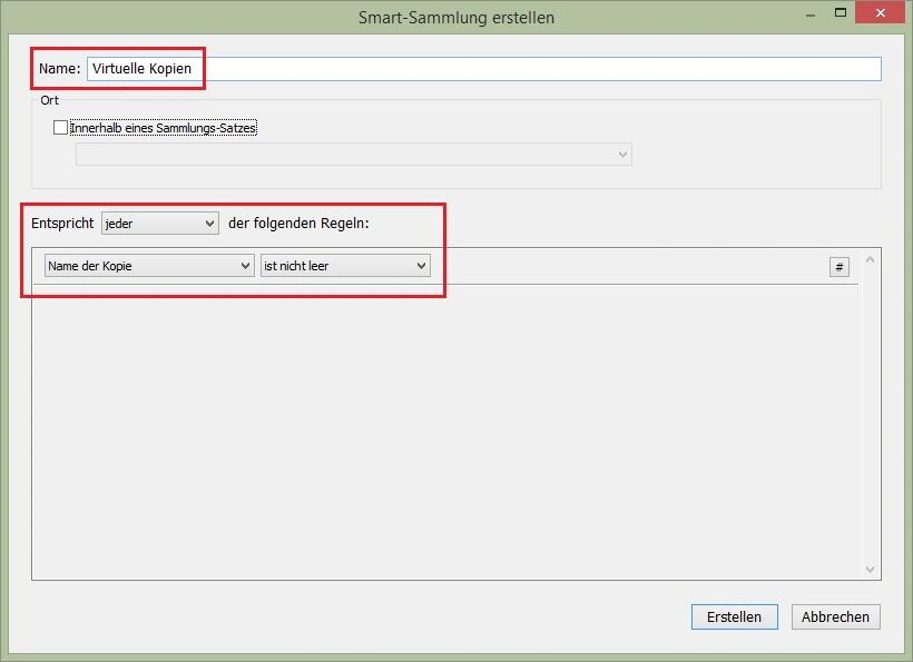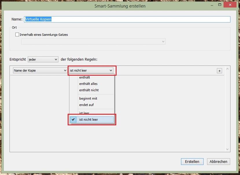 Daher kam mir der Gedanke, eine Smart-Sammlung anzulegen, die eben alle Virtuelle Kopien zusammenfasst. Leider ist im Dialog zur Erstellung von Smart-Sammlungen nicht so einfach ersichtlich, wie eine derartige Sammlung zu realisieren ist. Man muss ein wenig „um die Ecke denken“. Hier die notwendigen Schritte: