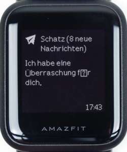 Benachrichtigungen von Smartphone an die Uhr senden können wohl die meisten Wearables. Da gibt es dann ein Signal oder eine Vibration an der Uhr, sobald etwas am Smartphone eingegangen ist. Doch dank des großen Bildschirms bekommt man an der Bip nicht nur ein Signal, sondern es wird direkt die komplette Nachricht angezeigt und man kann sie lesen. Und nicht nur das. Die Benachrichtigungen werden gespeichert, sodass man sie auch später noch an der Uhr lesen kann. Dabei funktionieren im Grunde alle Apps. WhatsApp, Facebook, Telegram oder Mail sowieso, aber auch zum Beispiel die DHL-App oder Kalenderbenachrichtigungen. Antworten über die Uhr ist natürlich nicht möglich. Leider kann die Uhr keine Umlaute und Emojis anzeigen. Bei Emojis kann man damit leben, bei Umlauten ist das aber ziemlich unschön. Stattdessen wird nur ein Kästchen angezeigt. Ein Bug nervt hier auch gewaltig: Komischerweise bekomme ich jede Benachrichtigung doppelt auf meine Uhr. Ich weiß nicht warum, aber auf Dauer ist es total störend. Daher habe ich die Notifications in der offiziellen App deaktiviert und nutze dafür eine alternative App. Dazu aber später mehr.
