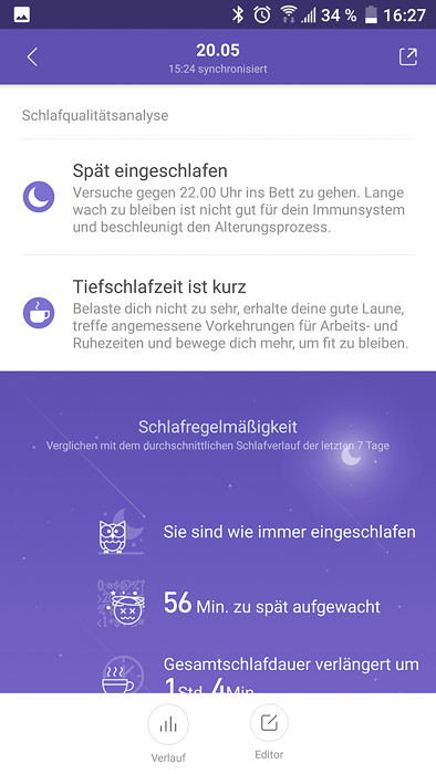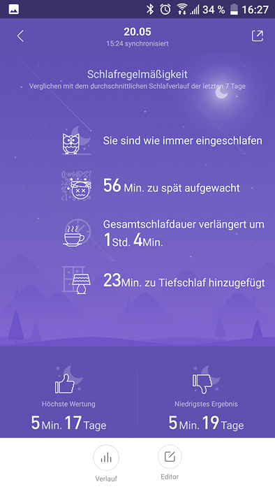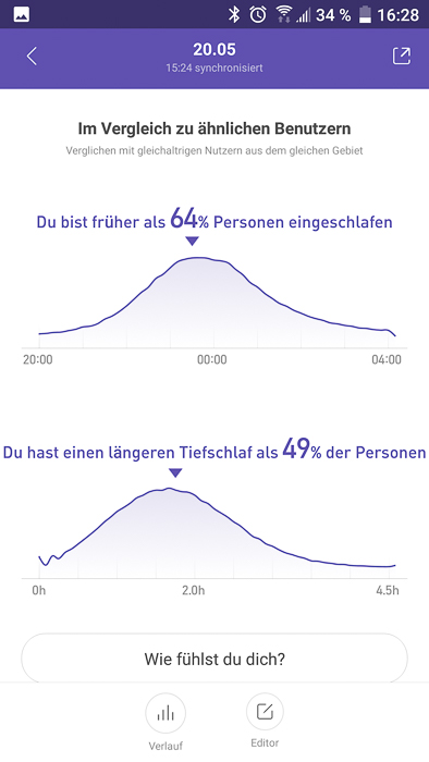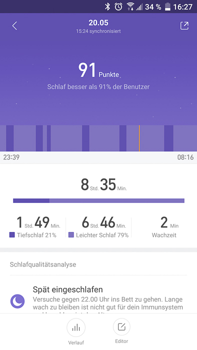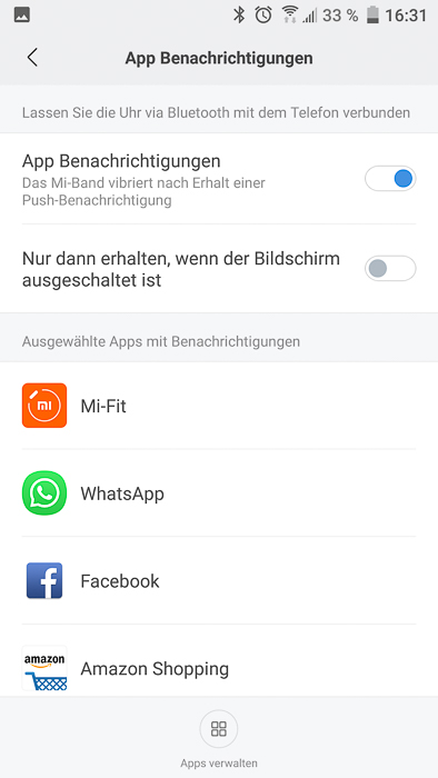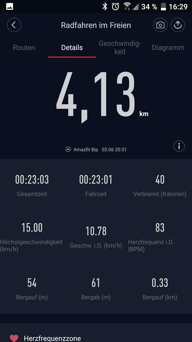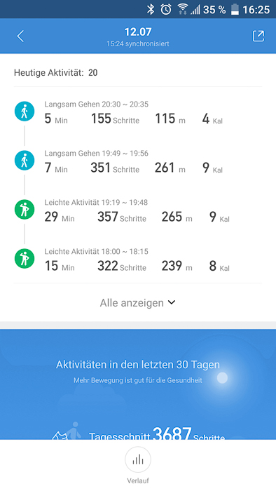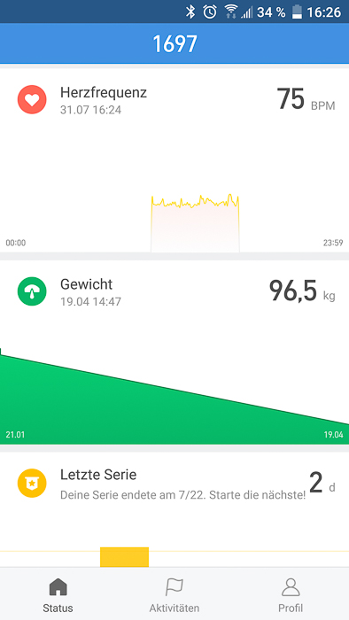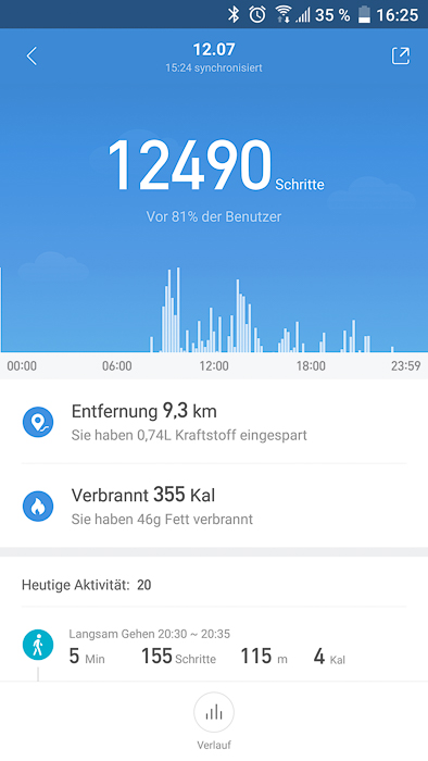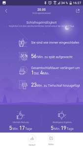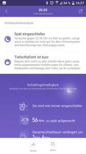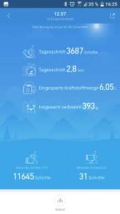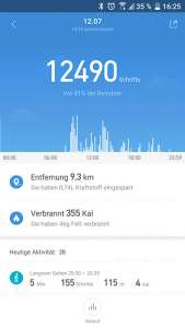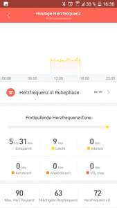 Um die Uhr nutzen zu können, braucht es zwingend die Mi Fit App. Und die App setzt einen Mit Fit Account voraus. Synchronisiert man die Daten von seiner Uhr mit der App, so werden die Daten direkt mit dem Account verknüpft und landen sicher irgendwo auf einem chinesischen Server. Dessen muss man sich bewusst sein. Es gibt zwar auch alternative Apps, mit der man die Bip angeblich auch verwalten kann, allerdings hat das bei mir irgendwie bei zwei Tests nicht funktioniert. Hat man sich einen Account erstellt und ist damit in der App angemeldet, muss man erst ein paar persönliche Daten eingeben wie Geschlecht, Alter, Größe und Gewicht. Anhand dessen wird dann wohl die km- oder Kalorien-Berechnung gemacht. Mithilfe der App lassen sich die von der Uhr erfassten Daten komfortabler einsehen als an der Uhr. Man sieht auf der Startseite groß die gelaufenen Schritte, dazu die Schlafdaten, die letzten Aktivitäten und die zuletzt gemessene Herzfrequenz. Weiterhin lassen sich über die App auch etwas bequemer Aktivitäten starten. Das ist vor allem dann nützlich, wenn die Uhr mal wieder meint chinesisch sprechen zu müssen, da die App mittlerweile doch in recht gutem Deutsch vorhanden ist. Auch die kompletten Einstellungen für die Uhr muss man über die App vornehmen, an der Uhr selbst gibt es nur sehr wenig Möglichkeiten. So kann man den Wecker einstellen, die Benachrichtigungen verwalten und das Ziffernblatt wechseln. Das nur eine grobe Übersicht der Funktionen der App. Sehr umfangreich ist sie nicht, aber sie tut, was sie soll.