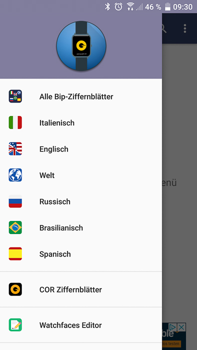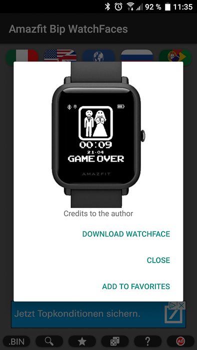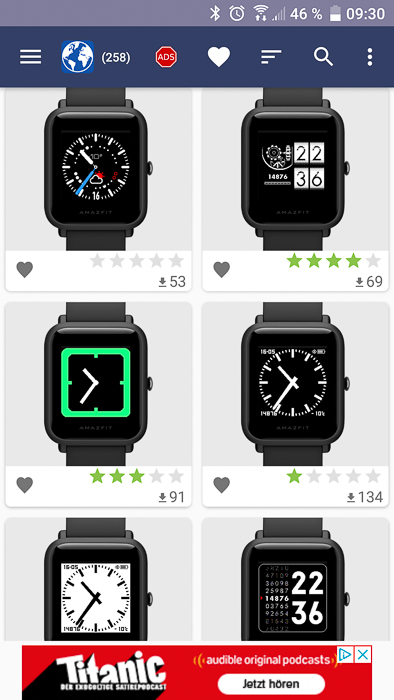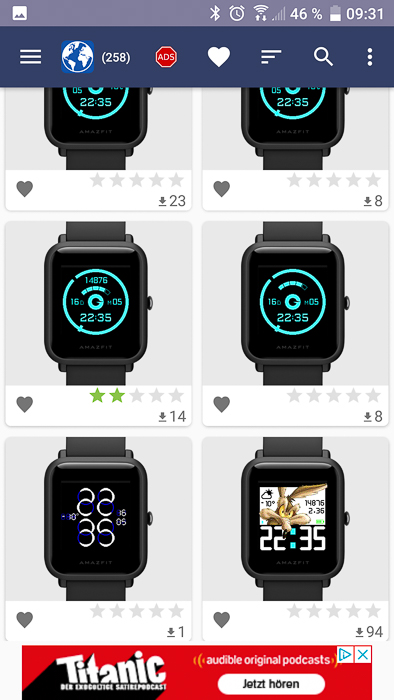 Wie schon gesagt ist man bei der Bip nicht auf die mitgelieferten Ziffernblätter beschränkt. Und das ist gut so. Denn mal ehrlich, so richtig hübsch sind die nicht. Ich empfehle daher die App Amazfit Bip & Cor WatchFaces. Dort sind wohl hunderte Ziffernblätter verfügbar, die sich recht einfach auf der Bip aktivieren lassen. Im Menü der App kann man die gewünschte Sprache auswählen und bekommt dann die passenden Watchfaces angezeigt. Es gibt zwar keine reinen deutschen, aber unter den englischen oder internationalen Blättern findet man auch genug Auswahl. Unter anderem auch ein paar ganz lustige. Die App kann zwar nicht eigenständig auf die Uhr zugreifen und das Ziffernblatt überschreiben, bedient sich aber eines kleinen Tricks in der Mi Fit App. Wie das funktioniert ist gut erklärt und simpel. Die App ist kostenlos und finanziert sich über Werbung. Durch einen In-App-Kauf lässt sich die Werbung deaktivieren.