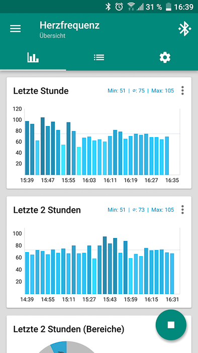 Auch mit dieser App lässt sich der Puls dauerhaft messen. Der Vorteil hier ist, dass sich der Verlauf viel differenzierter darstellen lässt. So kann man aus verschiedenen Graphen mit unterschiedlicher Zeitspanne wählen. Und das Ganze ist optisch etwas schicker aufbereitet als in der offiziellen App. Außerdem lassen sich hier auch individuelle Intervalle festlegen.