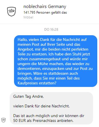 Also habe ich diesmal den direkten Kontakt mit noblechairs gesucht und auf deren Facebookseite einen Post abgesetzt. Man bot mir an, den Stuhl bzw. die Sitzfläche und die Rückenlehne (also fast den ganzen Stuhl) auszutauschen, doch ich fragte, ob auch ein Preisnachlass möglich sei. Das war es zum Glück, man bot mir 50 € Preisnachlass an, was ich angenommen habe. Nachdem ich denen die Rechnung zukommen lassen habe, war das Geld ein paar Tage später von Caseking an mich überwiesen.